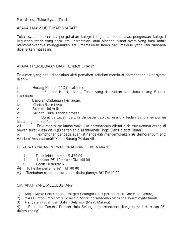 MAKLUMAT LANJUT PERTANYAAN. Semua Tanah Kerajaan di dalam Negeri Selangor KECUALI. Dibuat kepada Pentadbir Tanah Daerah di mana tanah itu terletak.